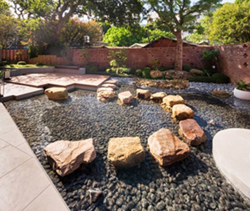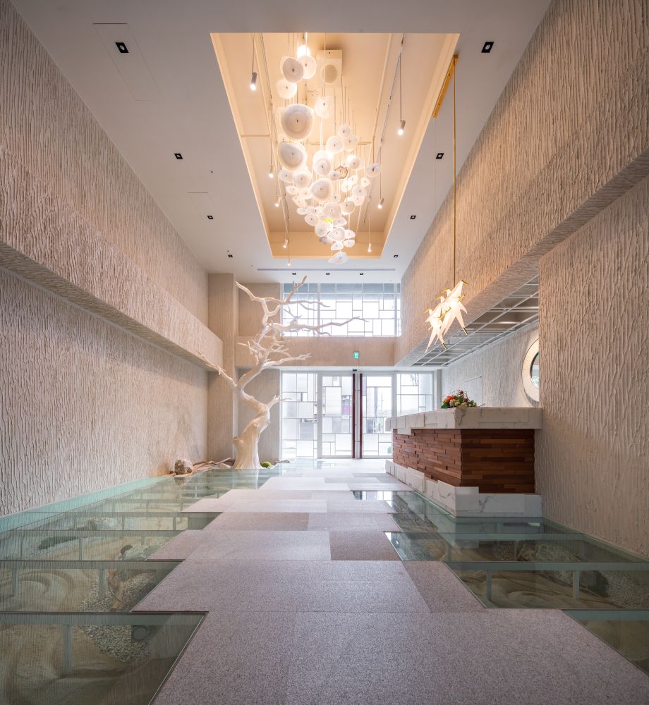 戶外庭院與大廳地板承襲枯山水的靜謐美學,以石為山、砂為水,透過抽象的景觀佈局,以極簡之姿表達大地的流動感,沙石與流水沿著軌跡緩緩漫流,使景觀與建築無縫交融。