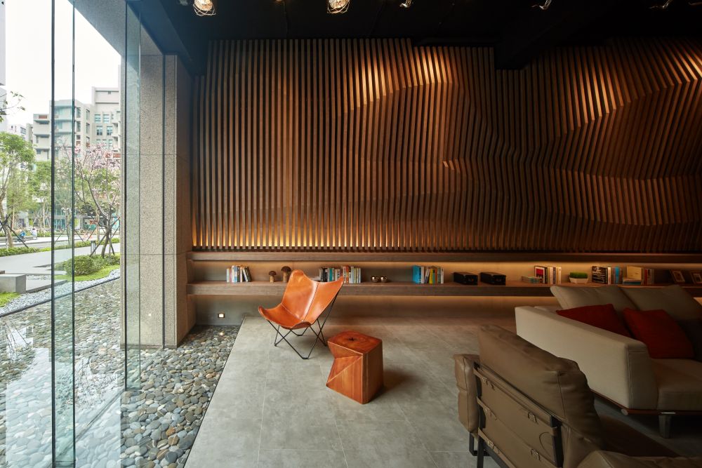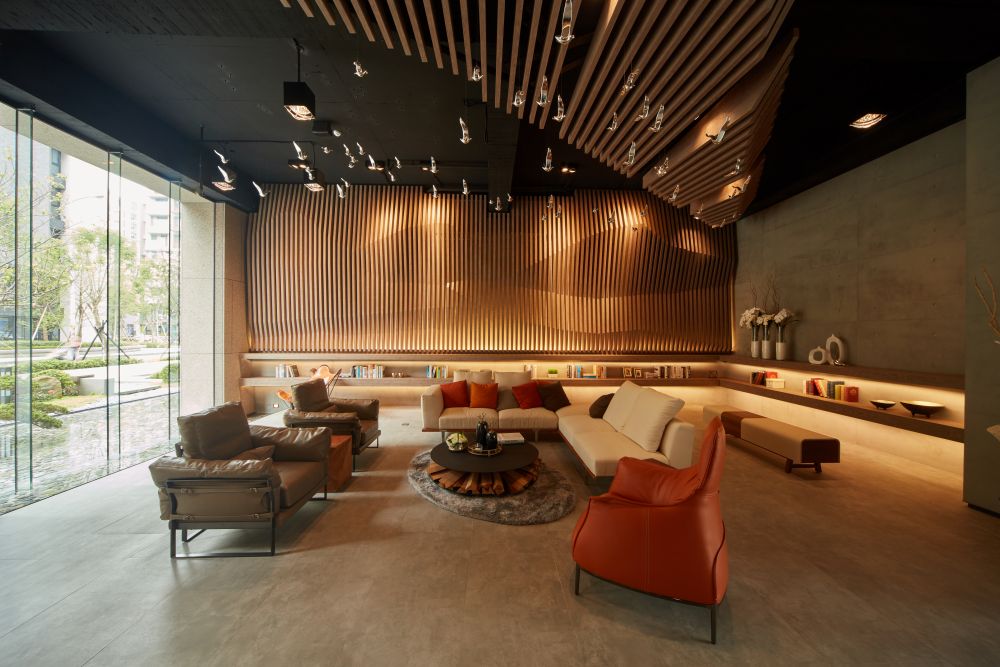 大廳與公共空間以書院氛圍為核心,層疊錯落的木質波浪造型天花,宛如書頁翻動,營造沉靜卻不失動感的視覺效果。開放式書牆結合藝術擺設,使空間既是閱讀角落,也是靜心冥想之所,讓文化與生活交織。